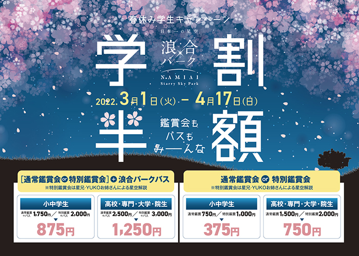 2022年3月1日(火)~4月17日(日)の期間、学生を対象とし、チケット購入時に「学生証」をご提示いただくと、星空観賞会が半額、さらに昼神温泉に泊まって昼神温泉郷⇔浪合パーク間を運行しているツアーバスをご利用のお客様はツアーバス代金が半額でご利用いただける「日本一の星空 浪合パーク 春休み学割キャンペーン」を実施します。