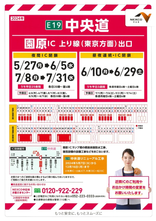 2024.05.23 NEWS 【名古屋・中津川方面の方へ】園原IC夜間閉鎖 中央道リニューアルのため園原ICが夜間閉鎖になります。 名古屋・中津川方面から高速道路を利用して浪合パークへお越しの予定の方はひとつ先の「飯田山本IC」での乗降でお越しください。(時間は飯田山本ICでもそこまで変わりません)