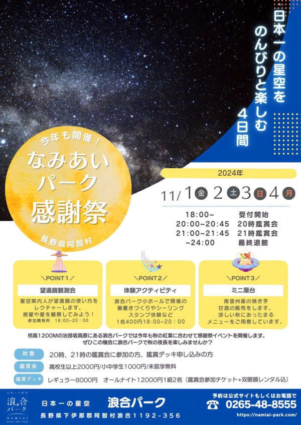 1年に一度秋の紅葉の時期に合わせて開催の浪合パークの感謝祭を今年も開催いたします。